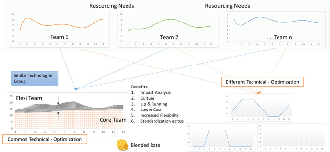 Based on the technical and group needs, the resources are classified, cross trained and ramped. These resources are either part of core team or flexible team, to provide the optimization benefits. In case of diversified classification, teams are optimized as per various cyclic demand and effort patterns. Teams are crossed across geographies to help keep motivation level of consultants, while providing end benefit to customer.